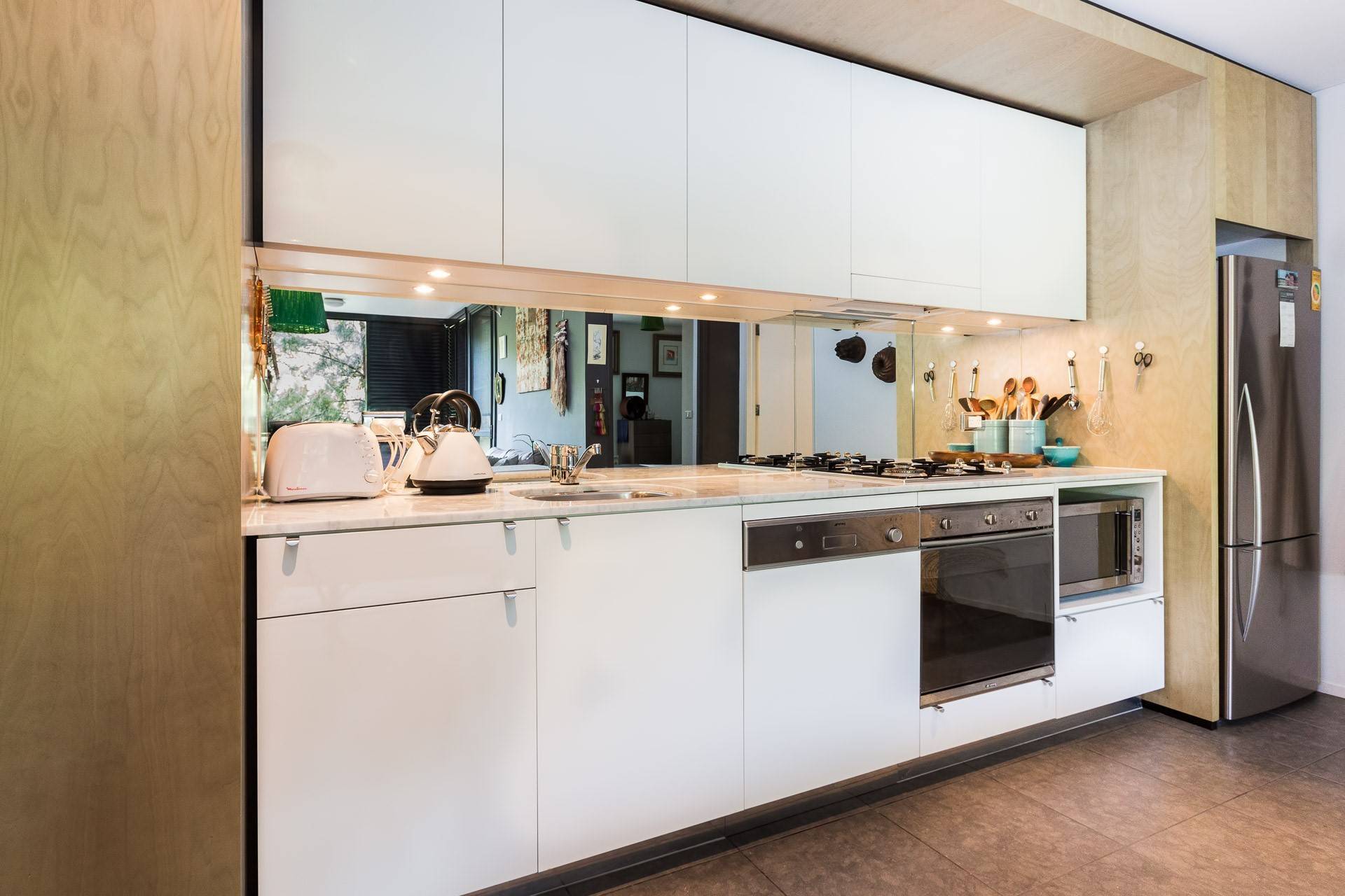* Stylish kitchen with stainless steel appliance, diswasher and gas cooking.