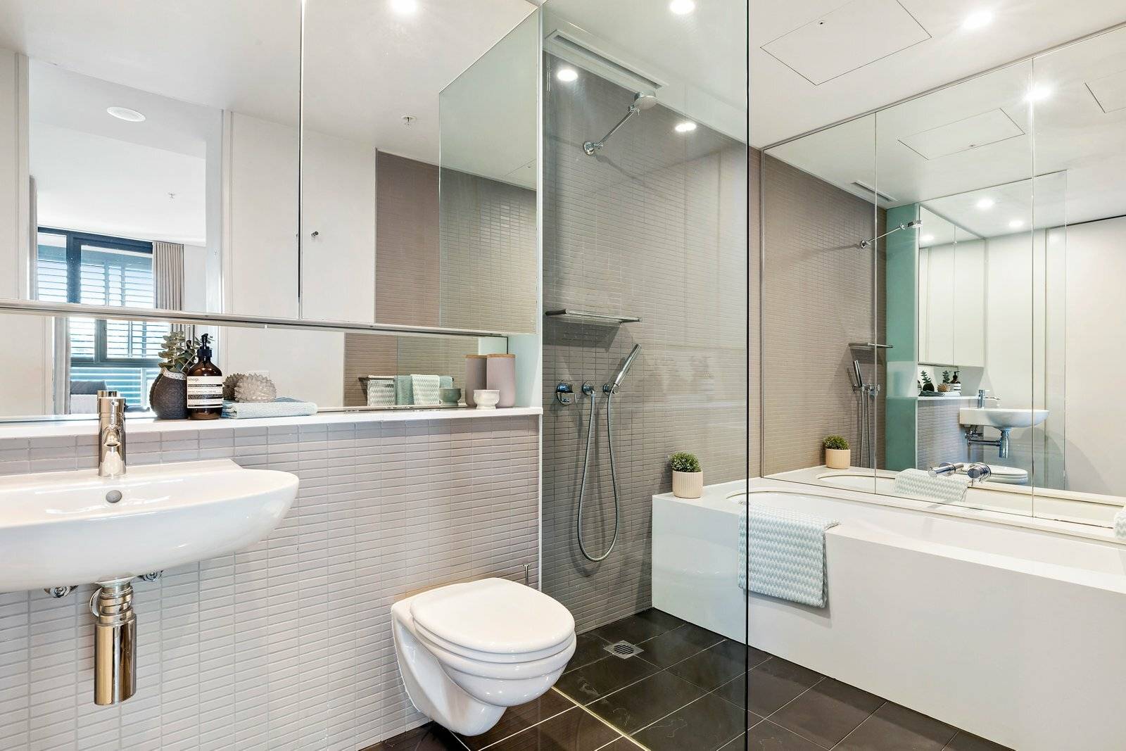 • Sleek bathroom with separate bath and shower