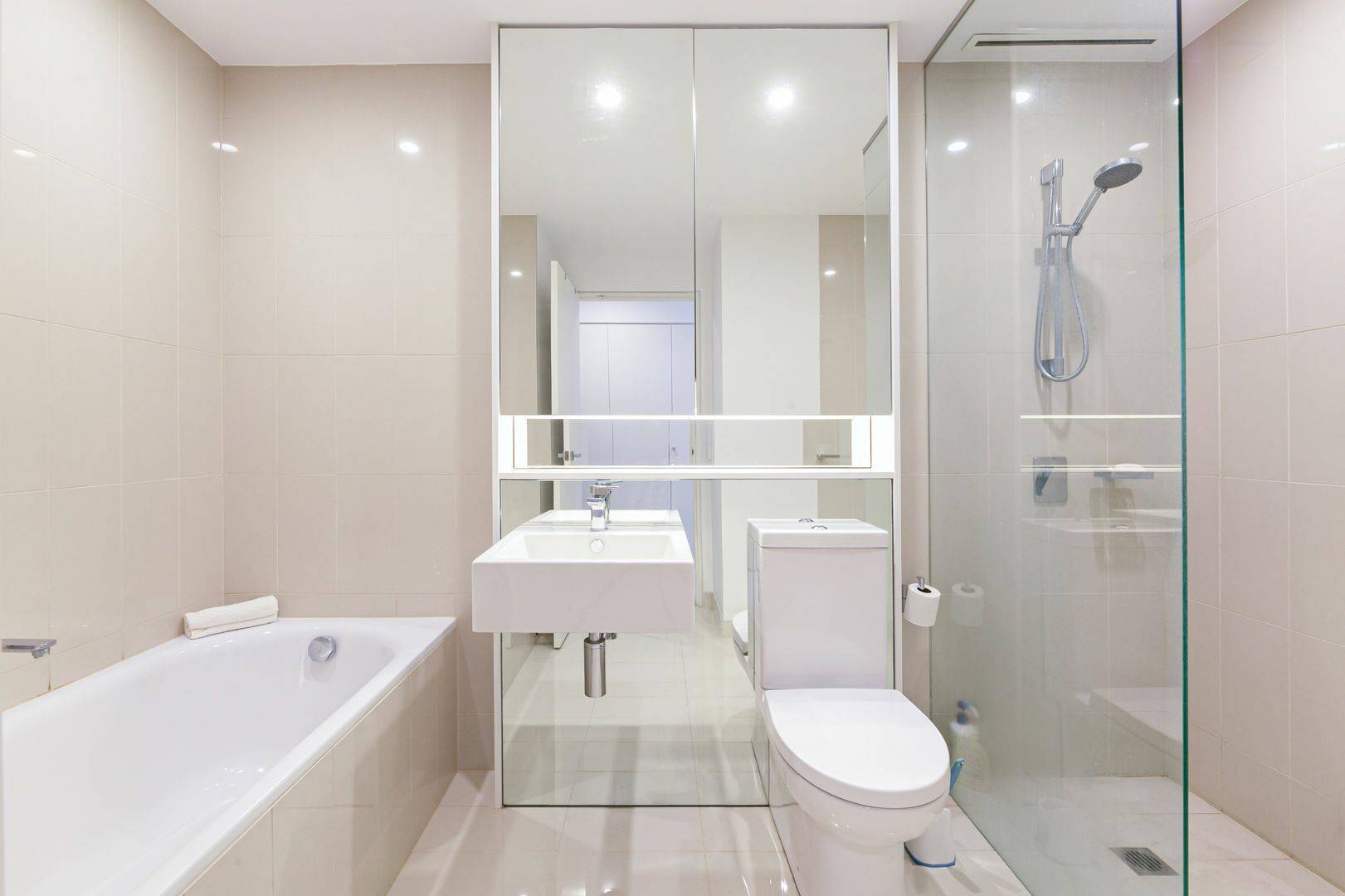 • Designer sleek bathrooms with wall-hung vanities, bath in main