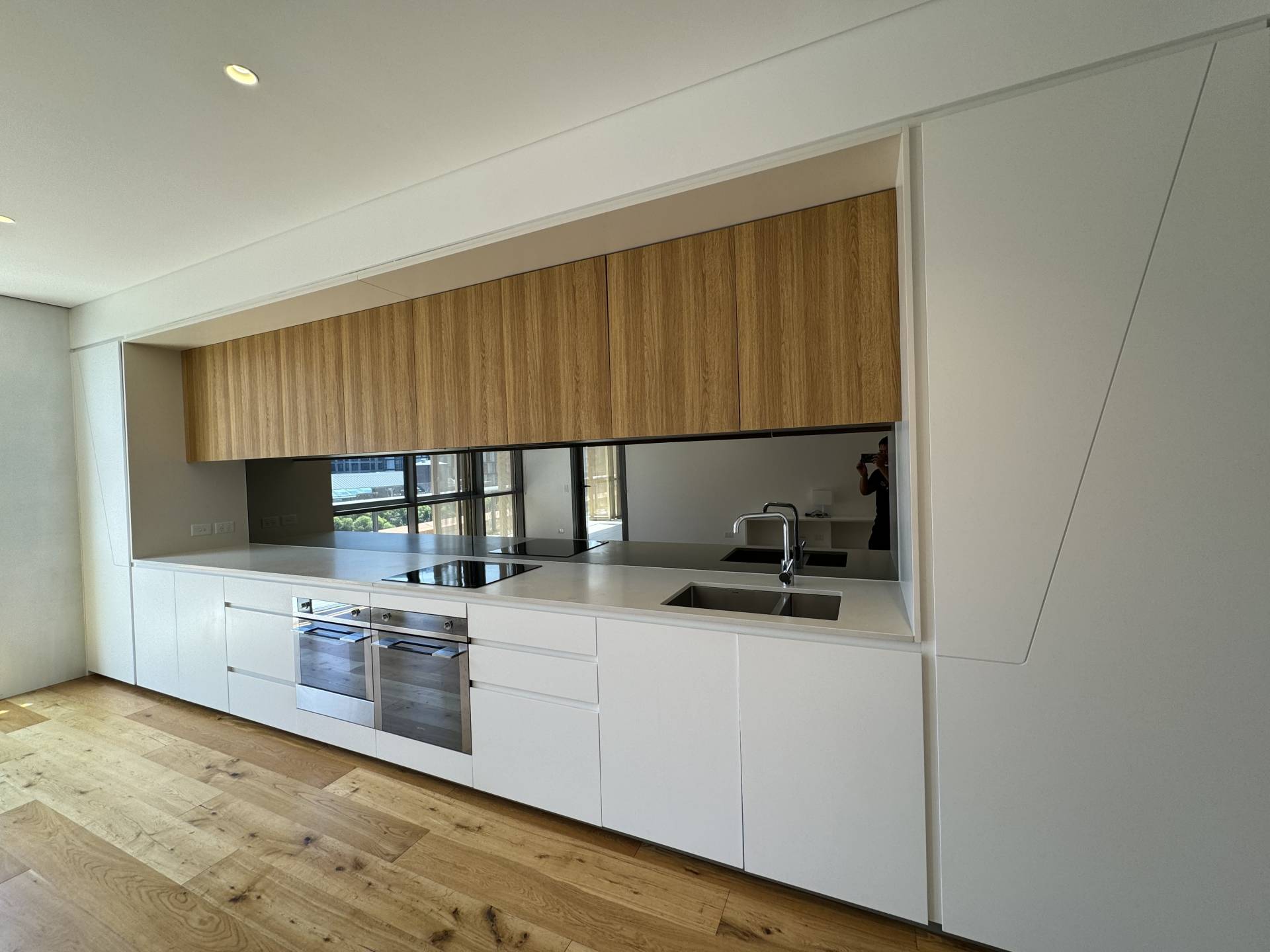 * Sleek kitchen with induction cooking and integrated dishwasher.