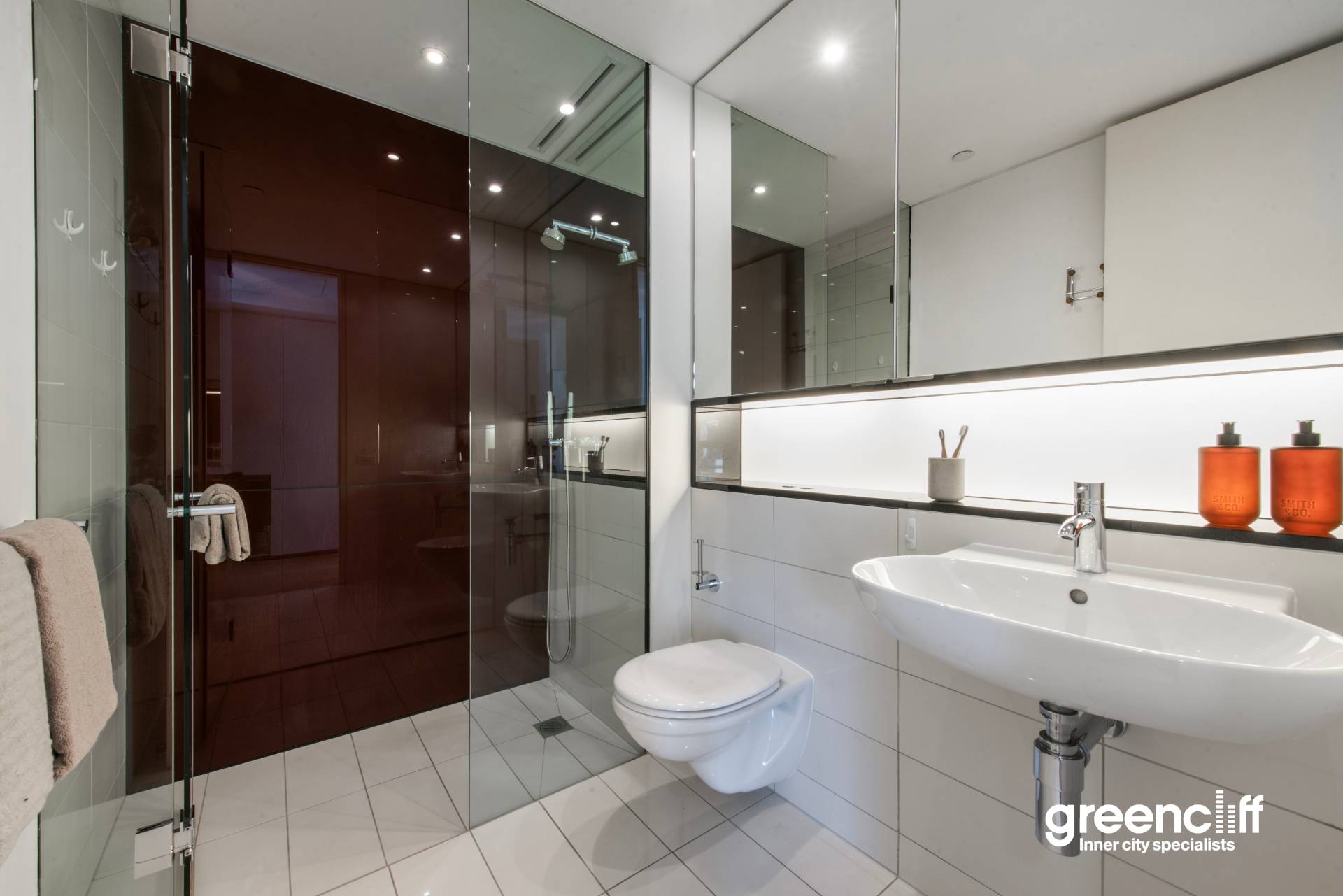 -Two modern bathrooms with frameless glass and ambient lighting